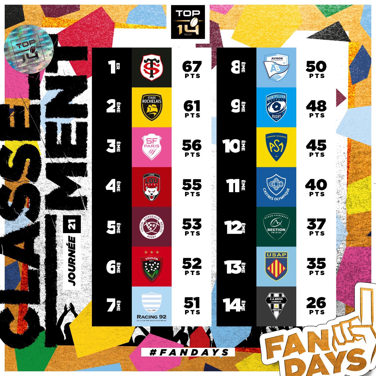 Web TOP 14 - Essai de Emmanuel MEAFOU ST - Racing 92 - Stade Toulousain - Saison 20222023 - TOP 14 - Essai de Dimitri DELIBES ST - Racing 92 - Stade Toulousain -. Web Top 14 20222023 Table Standings - Rugby Rankings Eurosport Advertisement Eurosport fuels the passions of fans EVERYWHERE Available on Eurosport app. Consultez le calendrier les résultats les classements.